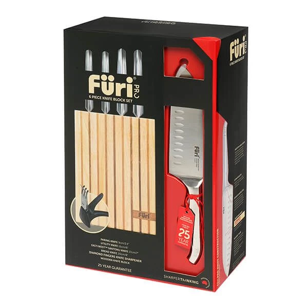 This Furi Pro wooden 3 piece knife block set includes a 9cm paring knife, a 15cm utility knife, a 17cm east/west santoku knife and a 20cm bread knife.