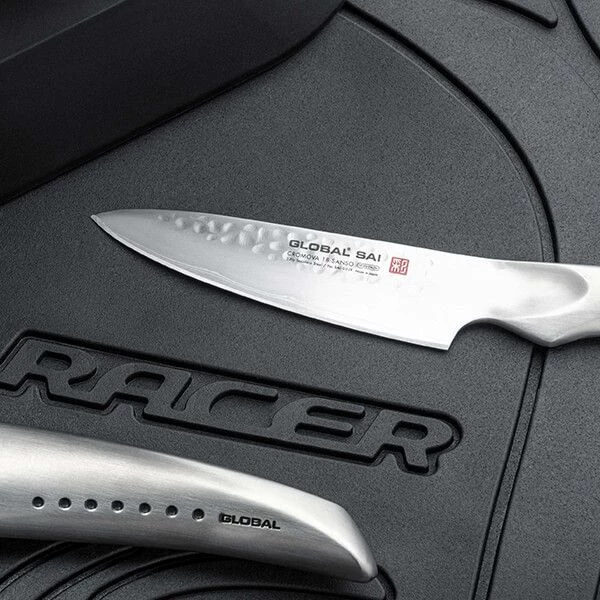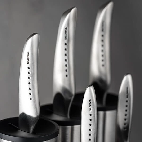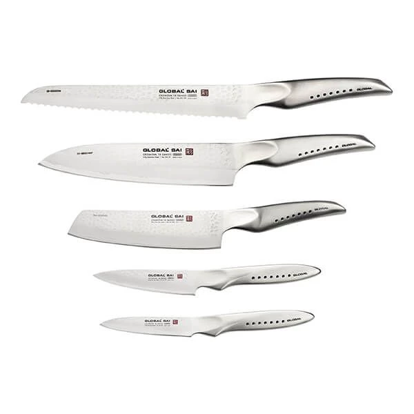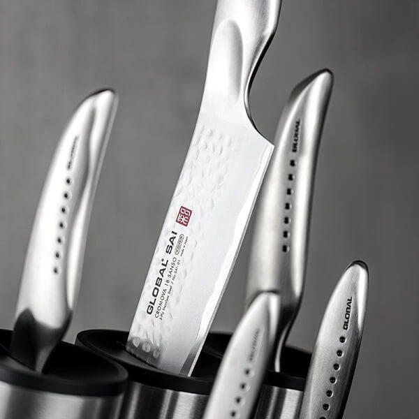 This Global Sai Cylinder Engine Block 5 Piece set, comprises: SAI-01 Chef’s knife, SAI-05 Bread knife, SAI-M06 Vegetable knife, SAI-S02 Utility knife and SAI-S01 Paring knife.