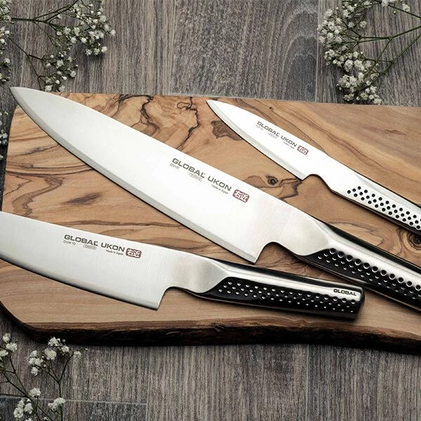 Each Global Ukon knife has a dual surface textured handle, the underside of the handle features Global’s trademark indentations, making the Ukon range extremely comfortable to work with.