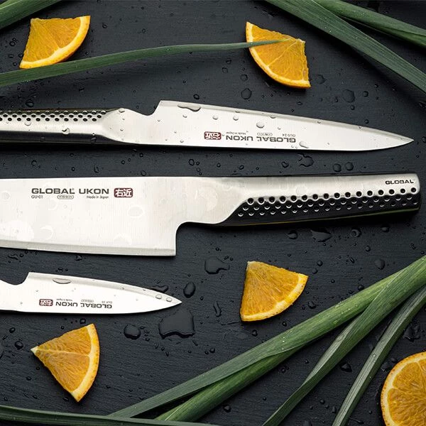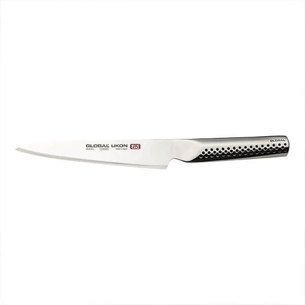 Each Global Ukon knife has a dual surface textured handle, the underside of the handle features Global’s trademark indentations, making the Ukon range extremely comfortable to work with.