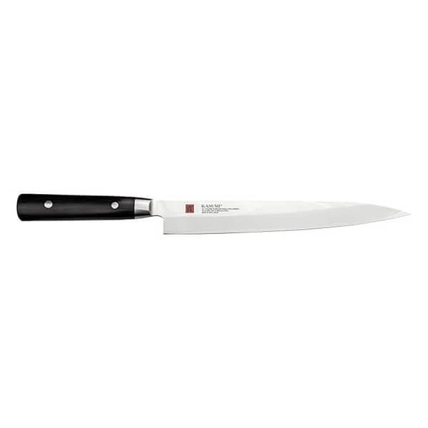 This Kasumi 24cm sashimi knife is made from 32 layer Damascus steel with a 59-60 Rockwell hardness.
