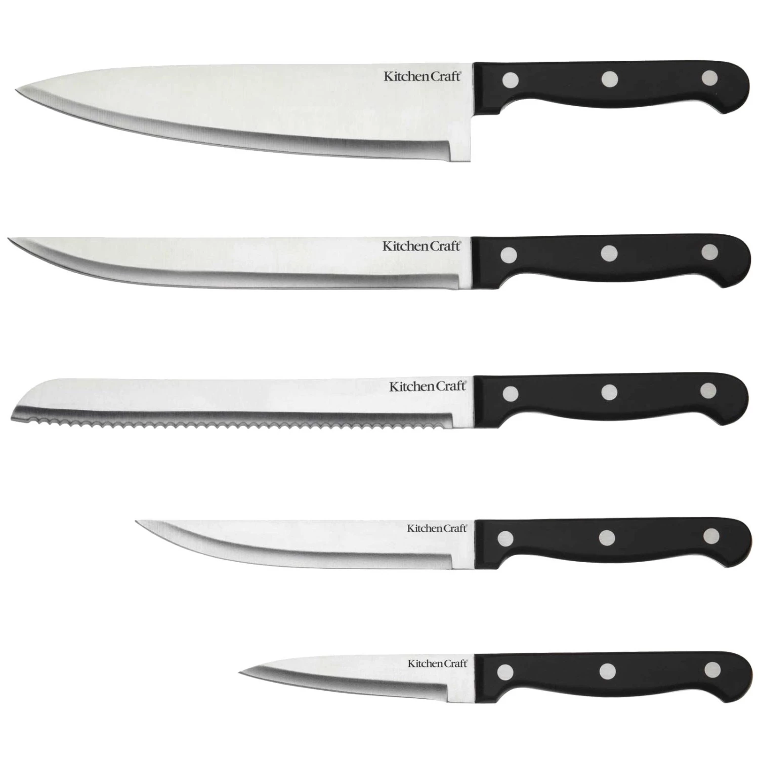 This stylish 5 piece knife set and block is designed with contrasting stainless steel and smooth black construction.