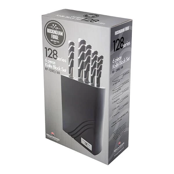 The Rockingham Forge RF-1280 Series 6 Piece Knife Block Set, includes the following: 1 x 10cm Paring Knife, 1 x 13cm Utility Knife, 1 x 20cm Bread Knife, 1 x 20cm Carving Knife and 1 x 20cm Chef’s Knife.
