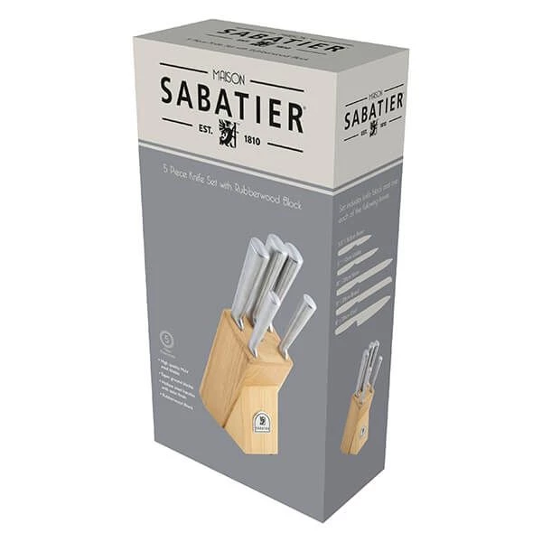 The Sabatier 5 Piece Knife Set is presented in a beautifully crafted rubberwood knife block for safe storage.