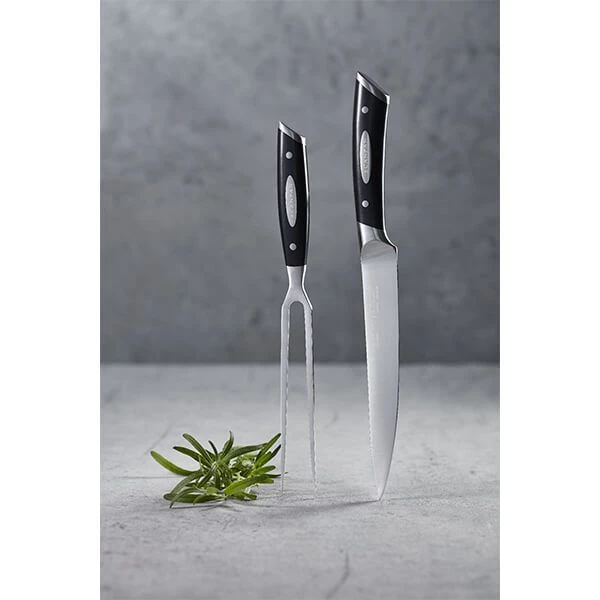 This Scanpan Classic 15cm Carving Fork firmly holds the roast in place while cutting, and helps to move the slices of meat during preparation.