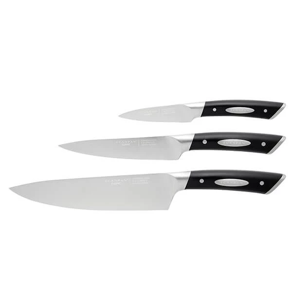 This Scanpan Classic 3 Piece Chef’s Set includes the following: 1 x 9cm paring knife, 1 x 15cm utility knife and 1 x 20cm chef’s knife.