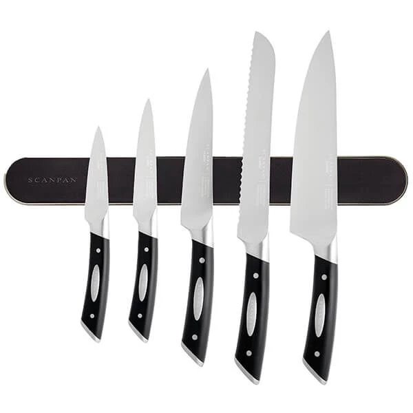 This Scanpan Classic 6 Piece Magnetic Knife Rail Set includes: 9cm paring knife | 11.5cm vegetable knife | 15cm utility knife | 20cm bread knife | 20cm chef’s knife | 38.5cm knife magnet.