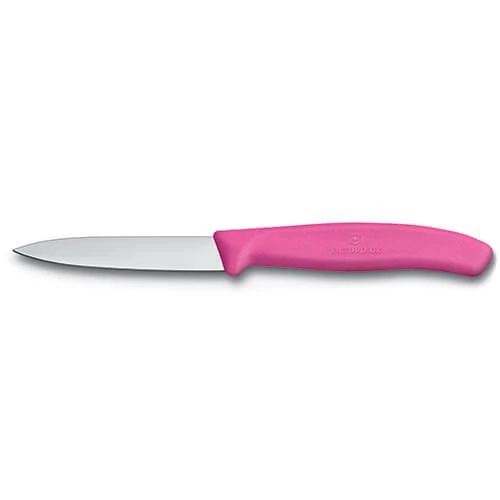 This pair of Victorinox Pink Paring Knives have stainless steel pointed tips with sharp straight edges which are ideal for preparing fruit, vegetables and precise preparation tasks.