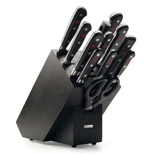 This 12pc Wusthof knife block set includes:an 8cm Paring Knife, 10cm Paring Knife, 14cm sausage knife, 17cm santoku knife, 20cm cook’s knife, 23cm carving knife, 23cm bread knife, 14cm boning knife, 16cm cleaver, 16cm meat fork, 23cm sharpening steel and a pair of kitchen shears.