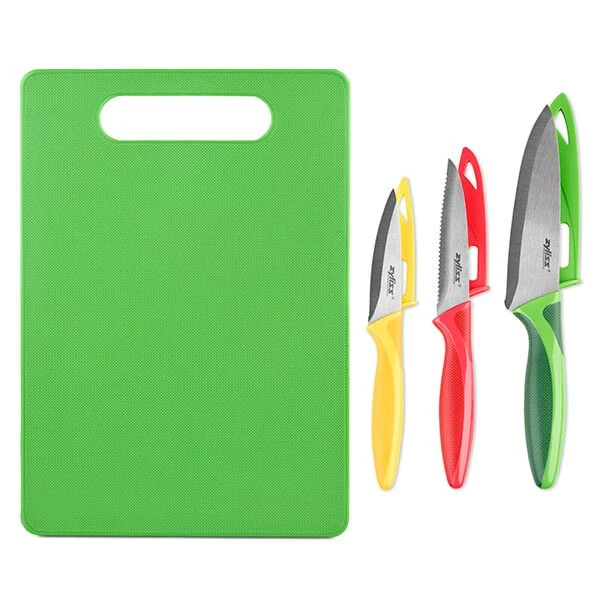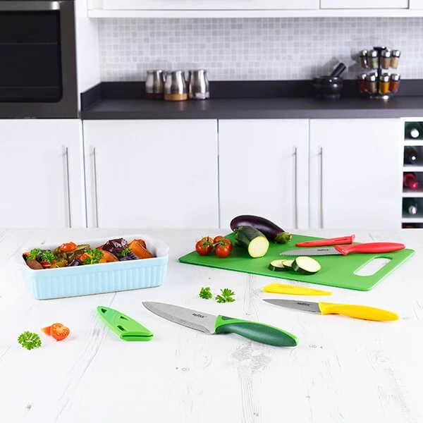 The 4 piece set includes a green chopping board 35 x 24.5cm, a 9cm paring knife, 10cm serrated paring knife and a 14cm utility knife.